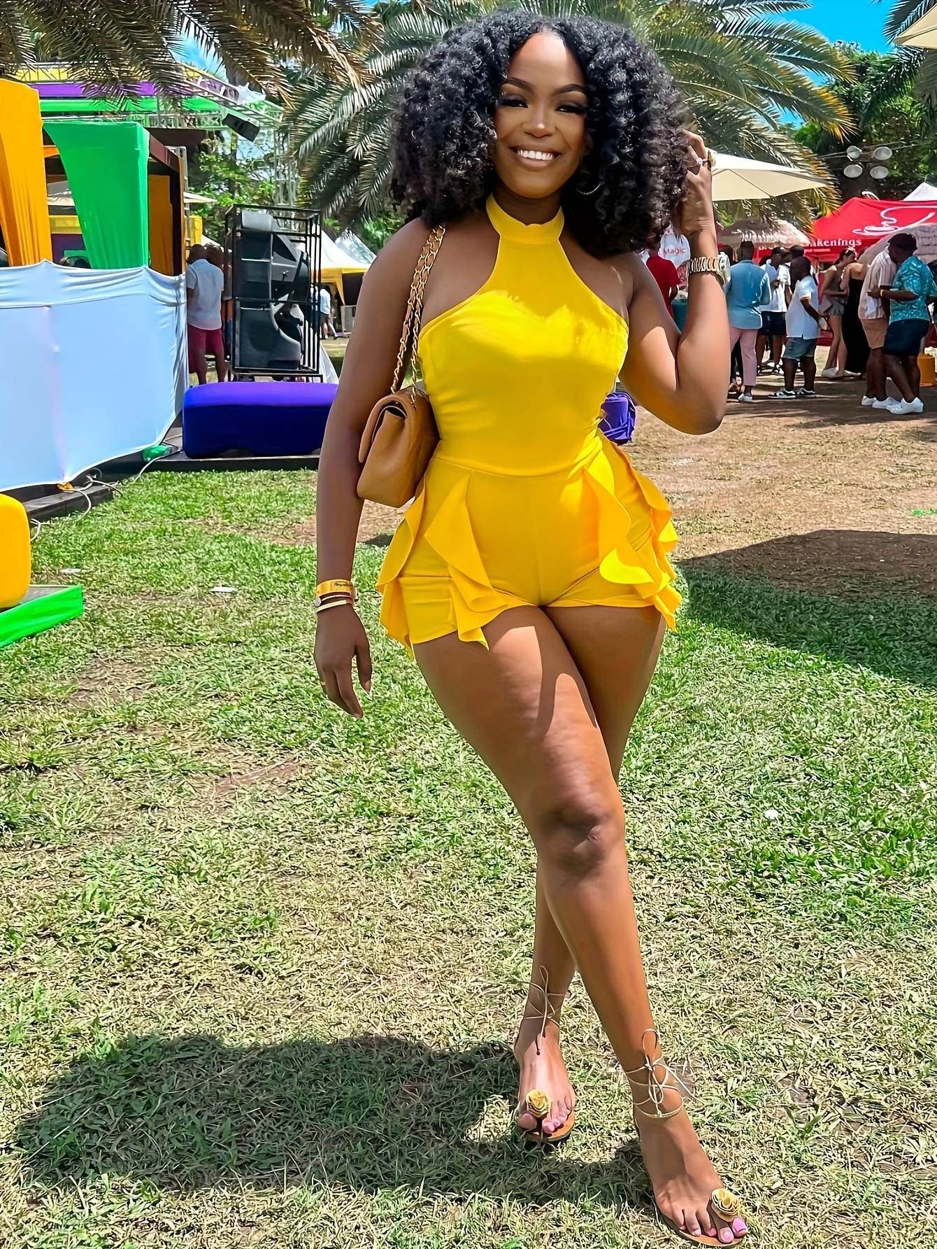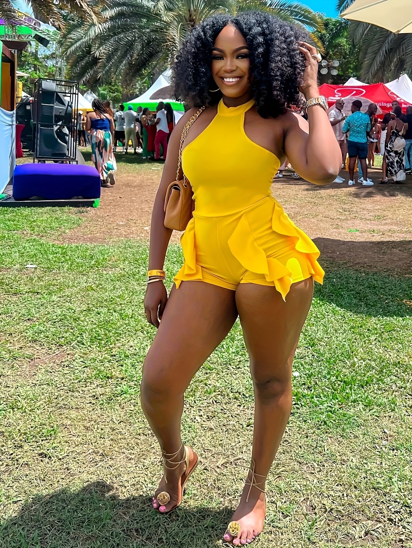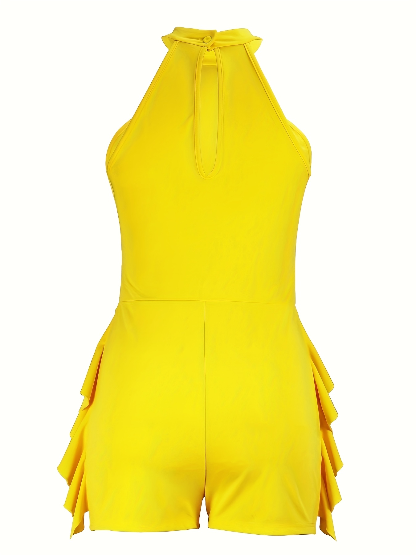 Women's Sexy Halter-Neck Romper with Flirty Ruffle Hem - Sleeveless Vibrant Yellow Stretchy Machine-Washable Jumpsuit for Spring/Summer Outings, Beach Parties & Casual Wear, Beach Dresses